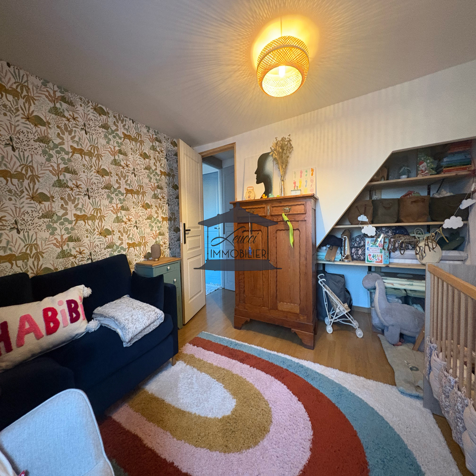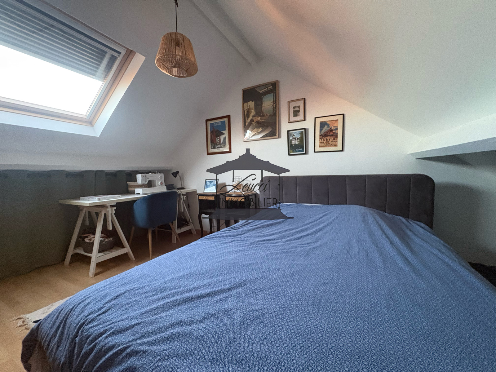 A l'étage l'espace nuit est de 2 chambres ainsi qu'un accès au grenier aménagé en 3e chambre.